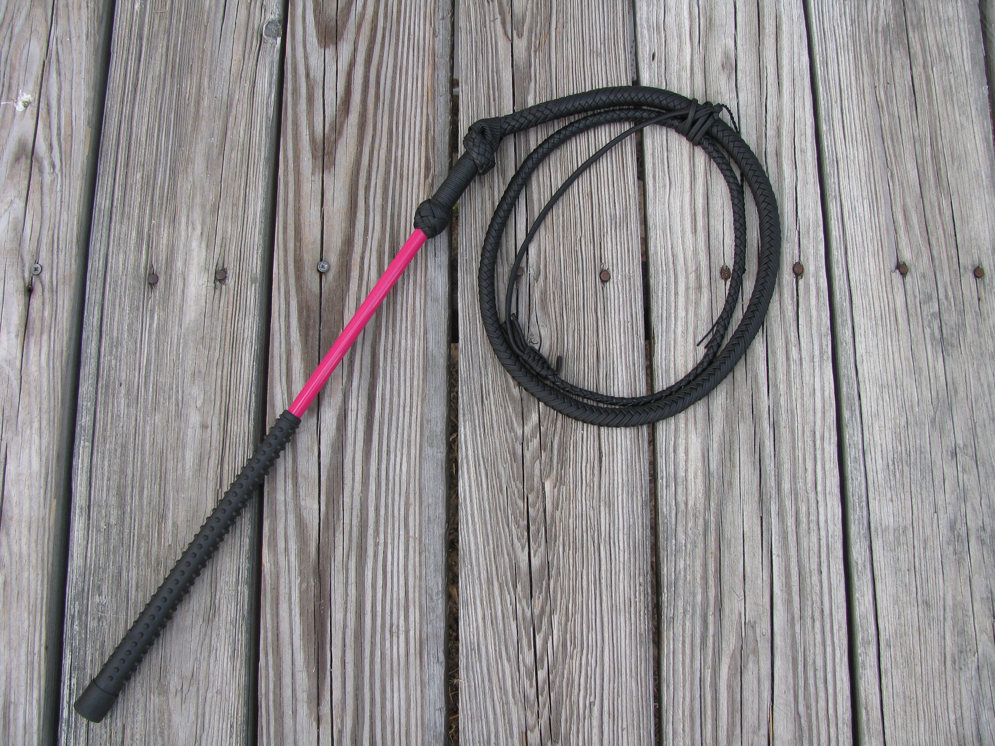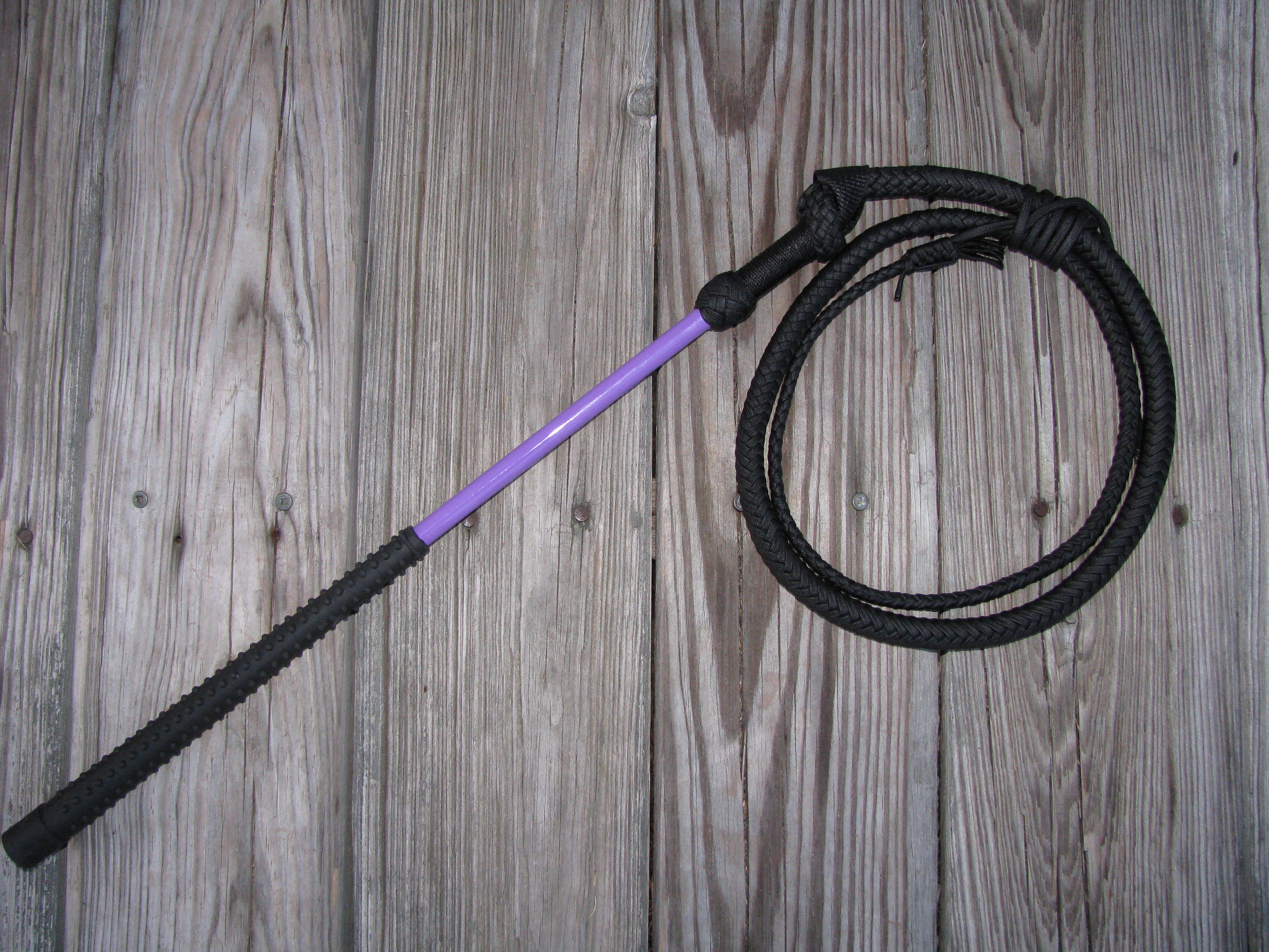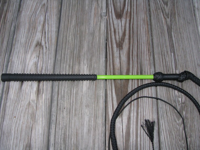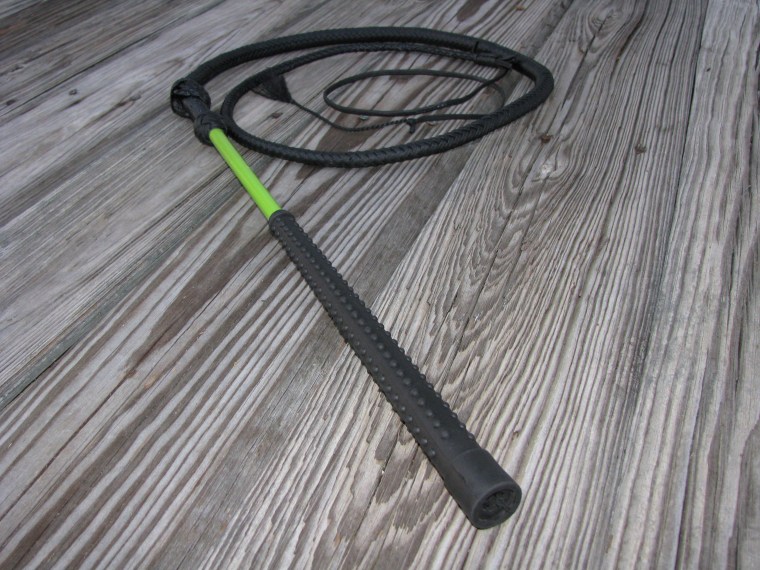 The budget stockwhip features a prefab 20″ fiberglass handle. By using a fiberglass handle with a non-slip rubber grip, it reduces the amount of time it takes for me to make the whip. At a base price of just $110.00, these whips are among the cheapest professionally made nylon stockwhips on the market. And although they are is priced cheap, it’s not cheaply made. Unlike a certain popular line of low priced whips from New Zealand, the thong of these stockwhips are handmade [by yours truly] to the same standards as my regular stockwhips -and cost less than the competition to boot. No machine woven nylon rope here! These little whips really crack nicely. It takes little effort to get a very nice crack out of them. With the 2 major customization options being the handle colors and the length, the whips are easier for me to make than some of my other more customized whip designs.
